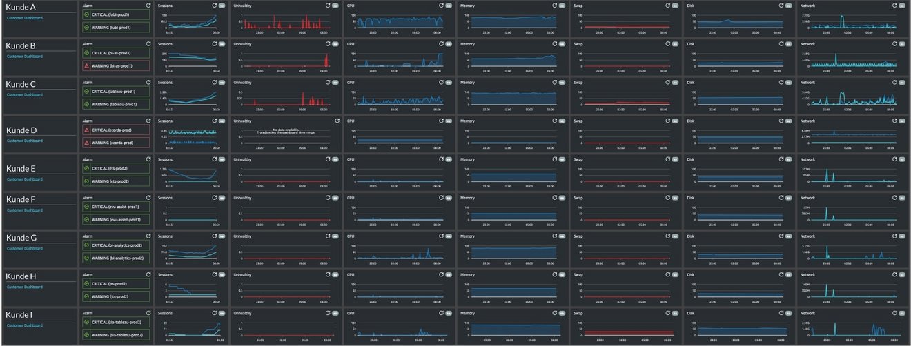 Das Dashboard zeigt Alarmzustände, angemeldete Nutzer auf dem System, Fehler in Tableau-Prozessen oder Systemmetriken an. Zu hohe Auslastungen einzelner Speicher oder Netzwerke können so schnell identifiziert und kommuniziert werden. Innerhalb kürzester Zeit können wir mit unseren Kunden in Kontakt treten, um mögliche Systemausfälle oder Störungen zu vermeiden und die richtigen Gegenmaßnahmen zu koordinieren.