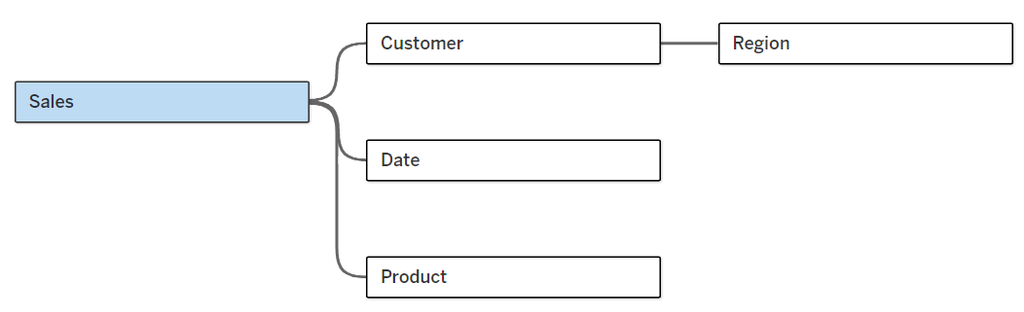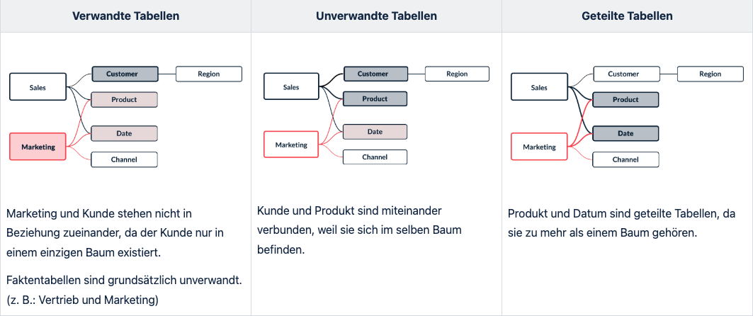 Manchmal sind Tabellen auch auf mehrere Bäume aufgeteilt. Geteilte Tabellen haben mehrere eingehende Beziehungen, gehören also zu mehr als einem Baum, und jede Tabelle, die unter diesen liegt, wird ebenfalls als geteilt betrachtet. Bei der Analyse führt dies häufig zu einer komplexeren Kombination von Daten, da Tableau versucht, verwandte Daten über mehrere Bäume hinweg zu verbinden.