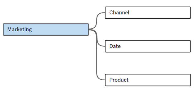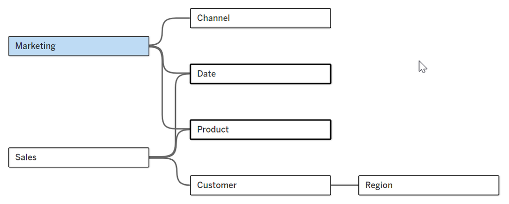 In einem traditionellen Tableau-Datenmodell ist eine einzelne Faktentabelle typischerweise mit verschiedenen Dimensionstabellen verbunden. Bleiben wir bei unserem Beispiel: Stellen Sie sich eine Datenquelle vor, in der eine Verkaufs-Faktentabelle mit Dimensionstabellen wie Produkt, Kunde und Datum verknüpft ist. Wenn Sie jedoch analysieren möchten, wie Marketingmaßnahmen – erfasst in einer separaten Marketing-Faktentabelle – den Verkauf beeinflussen, kann es kompliziert werden. Dies erforderte zuvor manuelles Zusammenführen oder komplexe Joins, was oft zu duplizierten Daten und einer langsameren Performance führte.