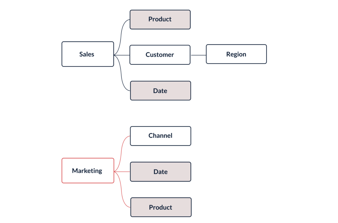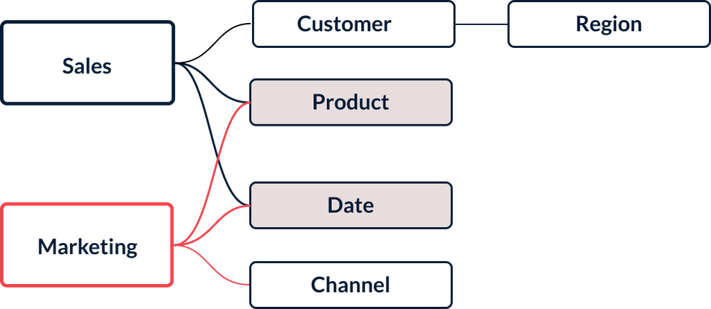 Mit der neuen Funktion können die User beide Faktentabellen problemlos über gemeinsame Dimensionen wie Produkt und Datum verbinden, wodurch das Modell vereinfacht und der Prozess optimiert wird (siehe unten).