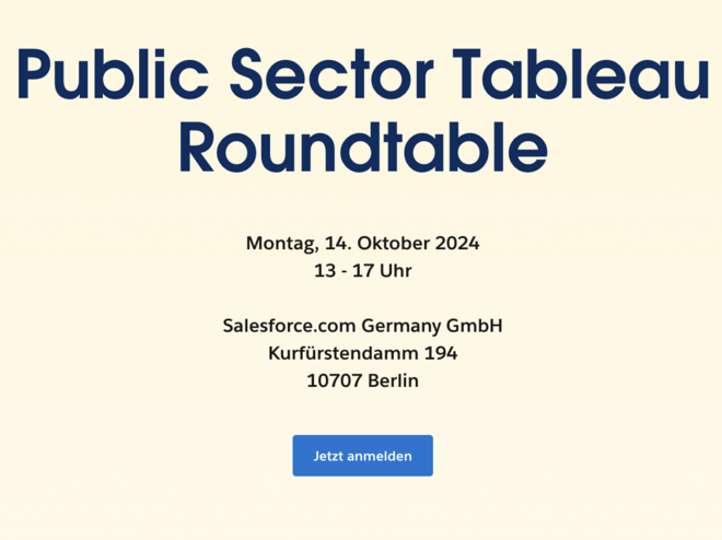 Bei unserem Roundtable Event "Sichere und intelligente Datenanalyse mit Tableau" für den öffenlichen Sektor im Salesforce Office in Berlin haben wir gemeinsam mit unserem Partner Tableau Cloud-Lösungen, AI-Integration und Best Practices für Behörden vorgestellt. Unter dem Motto "sichere und intelligente Datenanalyse" sind sich Expert*innen begegnet und haben sich darüber ausgetauscht, wie NextGen Business Intelligence den öffentlichen Sektor transformieren kann.