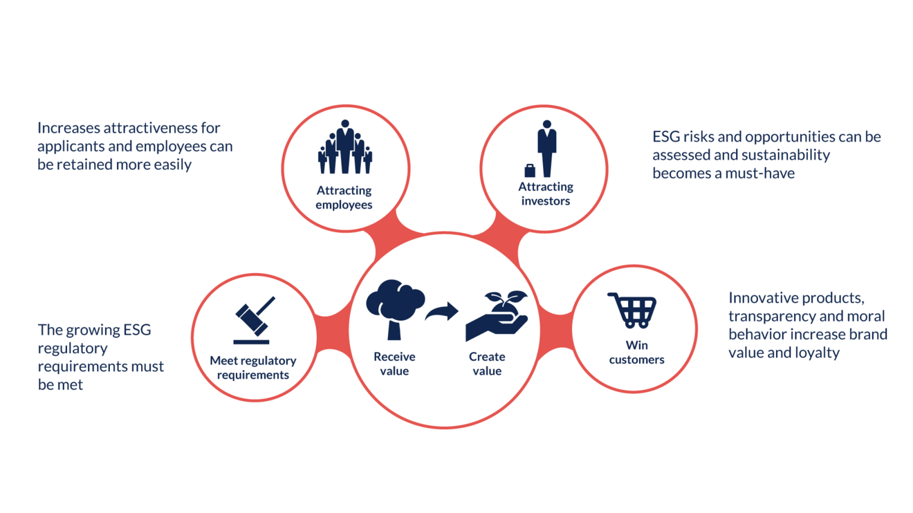 84% of investors actively incorporate ESG criteria into their investment decisions. In addition, companies with a good sustainability record are more attractive as employers for many applicants in a highly competitive market for skilled workers. Last but not least, customer acquisition also plays a role for companies, regardless of B2B or B2C business, as ESG reporting is also important as part of the supply chain so that the business partner can include the necessary information in their own ESG reporting. The dependence of companies on receiving ESG information from suppliers can therefore be a decisive criterion for future cooperation.