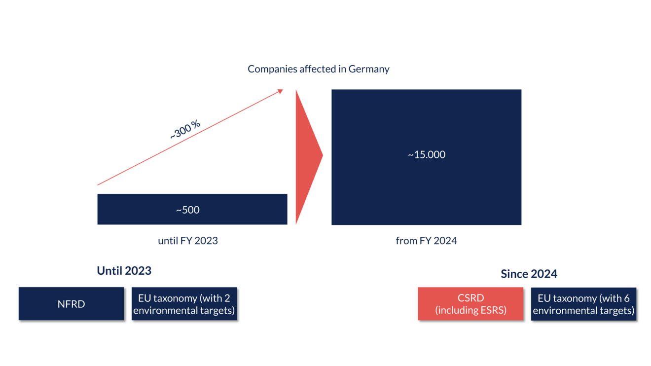From the financial year 2024, the proportion of companies affected by the Non-Financial Reporting Directive (NFRD) will increase significantly. While around 500 companies had to publish a sustainability report until 2023, around 15,000 companies across Germany and 50 million companies across Europe will now be affected from 2024. In addition, the EU taxonomy, which contained two environmental targets until 2023, will be expanded to include four more environmental targets.