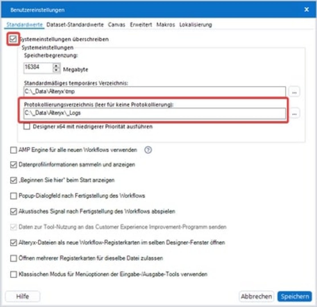 To enable logging for all workflows, you have to activate the Override system settings option in the settings and set a log directory there. It is advisable to place this in an easy-to-find location so that it can be found again later without having to go back into the settings.