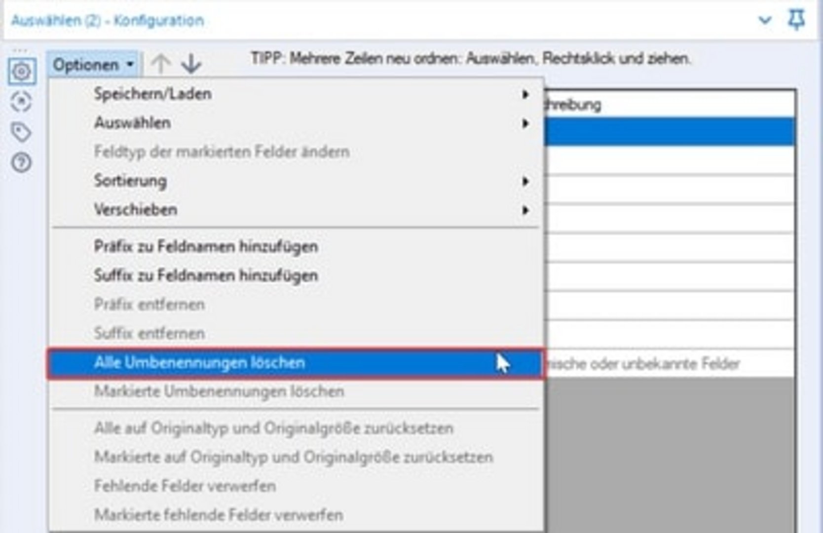 During Select as well as during Join it happens from time to time that an automatic or manual renaming has to be undone or should be undone. A simple way to do this is via the Options menu in both tools.