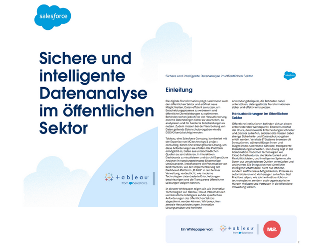 Erfahren Sie, wie moderne Datenanalyse Behörden unterstützt, sichere und effiziente Entscheidungen zu treffen. Das Whitepaper zeigt, wie Cloud-Technologien, KI, DSGVO-konforme Strukturen und leistungsstarke Visualisierungstools wie Tableau den öffentlichen Sektor transformieren. Praxisbeispiele wie das Berliner D:ASH-Projekt verdeutlichen, wie datengetriebene Innovation Transparenz, Effizienz und Bürgervertrauen nachhaltig stärkt.